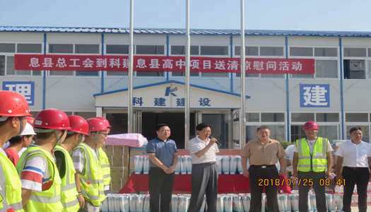 2018年07258:30,息县原副县长吴昊、总工会主席戴清金,息县城市建设投资有限公司息县高中项目建设指挥部刘增书记等一行,顶着炎炎烈日前往息县高中一期项目部慰问送清凉活动。息县总工会为一线建筑工人送来了防暑降温慰问品:雨伞、水杯、霍香正气水、毛巾、香皂、矿泉水、牙刷及牙膏共800多套。