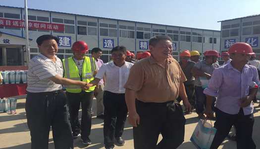县领导、总工会主席还向工友们发放了慰问品,他们高兴地接过慰问品,并赞道这样的热天还是县领导、总工会领导时刻牵挂着我们,为我们送来了凉爽!我们一定要把活儿干好,保证质量按时完工!