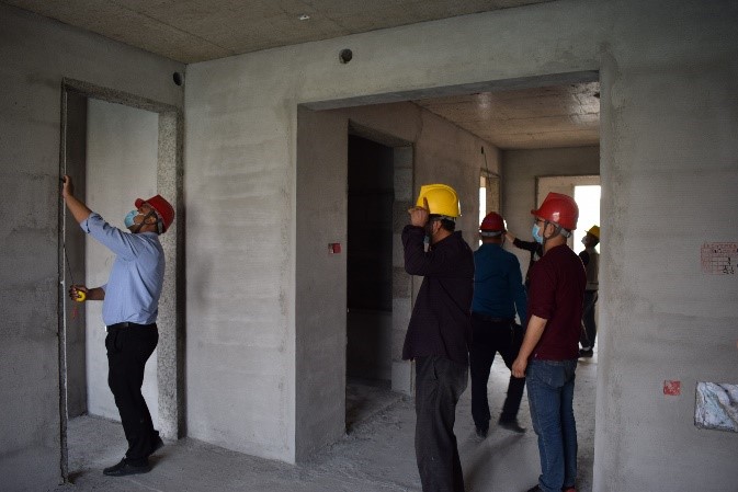 实测实量小组由锦艺四季城K地块、Q地块项目技术负责人朱耀朋、武培月带队陪同第三方评估人员,主要对主体的垂直度、平整度,楼板厚度,构件截面尺寸,顶板水平度,以及抹灰工程的垂直度、平整度,阴阳角方正度、房间方正性、墙面空鼓开裂和观感等进行了系统的评估和检测。